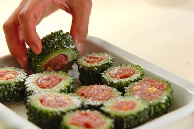 ゴーヤの水気を拭き取って軽く小麦粉を振り、(1)の<タネ>を詰め、さらに切り口に薄く小麦粉をからめる。