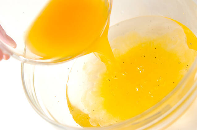 粗熱が取れたら網でこしてレモン汁とオレンジ果汁を加え混ぜる。