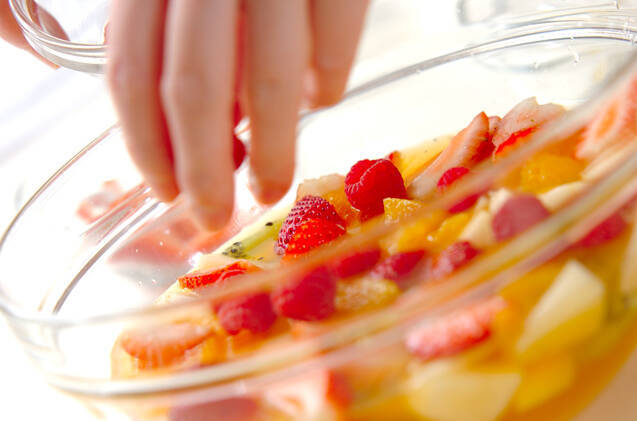 2にフルーツを加えて冷蔵庫で冷やす。ガラスの器などに注ぎ入れミントの葉を飾る。※ 炭酸水で割っても美味しいですよ。