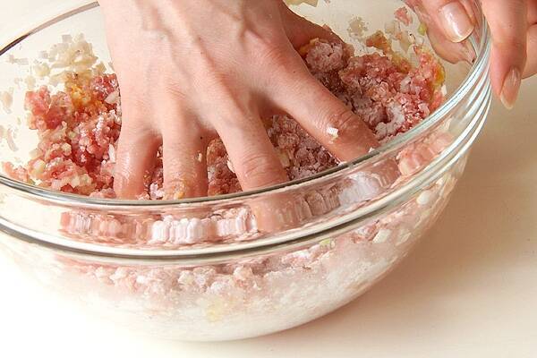 <肉団子>の白ネギは、縦に切り込みを入れてみじん切りにし、他の材料と粘りが出るまでよく混ぜ合わせる。