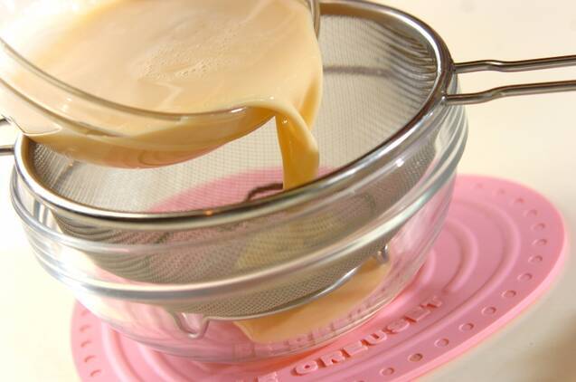 ボウルに卵を入れてほぐし、砂糖を加えて白身を切りながら溶きほぐす。豆乳と牛乳を加えてひと混ぜし、ザルで濾し耐熱容器に入れる。