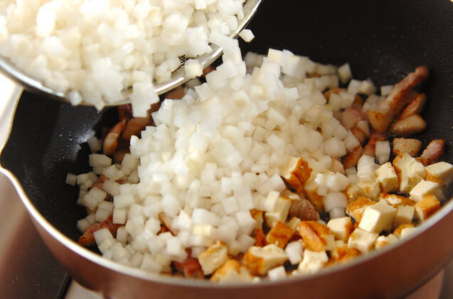 フライパンに豚バラ肉を入れて中火にかけ、しっかり炒める。大根、油揚げを加えてさらにしっかり炒め合わせ、大根葉、かつお節、粉かつお、白ゴマも加えて炒め合わせる。