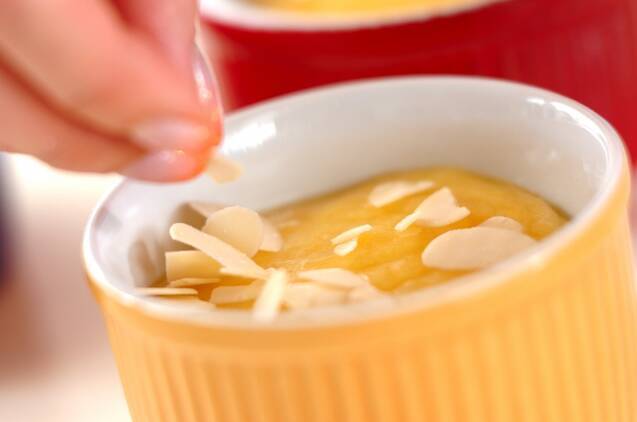 ココット皿に(2)を流してスライスアーモンドをのせ、170℃に予熱しておいたオーブンで10~15分焼く。