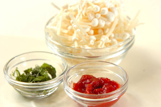 梅干しは種を取り、包丁でたたいてペースト状にする。