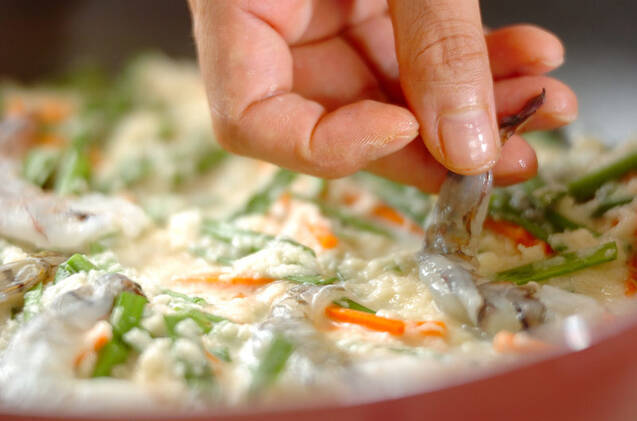 <生地>を半量に分け、ニラとニンジンを半量ずつ加えて混ぜ合わせる。フライパンにサラダ油大さじ1を入れて中火にかけ、<生地>を流し入れ、エビを並べ入れる。