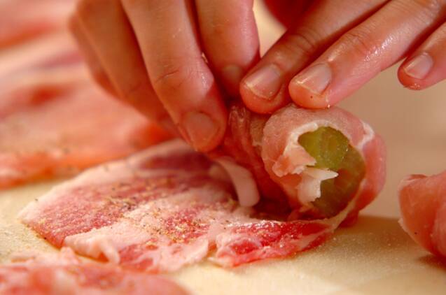 まな板に豚肉を重ならないように広げ、塩コショウを振り、薄く小麦粉を振る。手前にフキをのせてクルクルと巻き、はがれないようにしっかり押さえ、全体に小麦粉を薄くからめる。