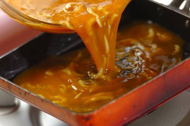 卵焼き器を中火で熱してサラダ油を薄くひき、卵液の1/3量を流し込んで全体に広げる。