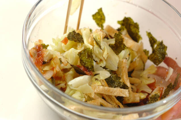 <梅ダレ>のボウルにキャベツ、油揚げ、焼きのりを加えてよく混ぜ合わせ、器に盛る。