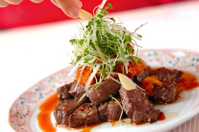 フライパンにサラダ油を熱し、牛肉を強火でサッと焼いて器に盛り、混ぜ合わせた<キムチソース>をかけ、白髪ネギをのせてニンニクチップを散らす。