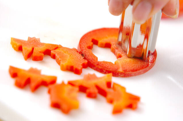 カブ、大根は皮をむいて1cm角くらいに切る。金時ニンジン、キュウリは薄切りにして型で抜く。塩大さじ1強を溶かした500mlの水に10~15分浸ける。※ 斜め切りにすると、切った面積が大きくなりますので型抜きがしやすくなります。