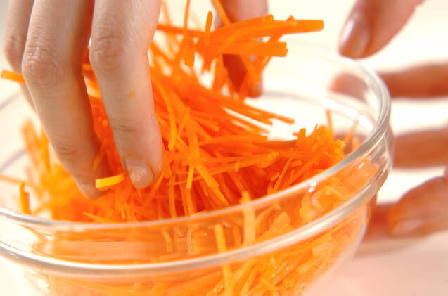 ニンジンは皮をむいてせん切りにし、分量外の塩をからめる。しんなりしたら、水気を絞る。