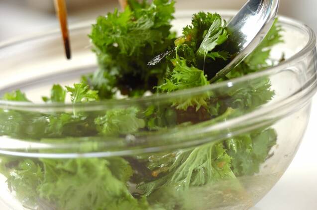 ボウルに<チョレギドレッシング>の材料を混ぜ、ワサビ菜と和える。器にふんわりと盛る。