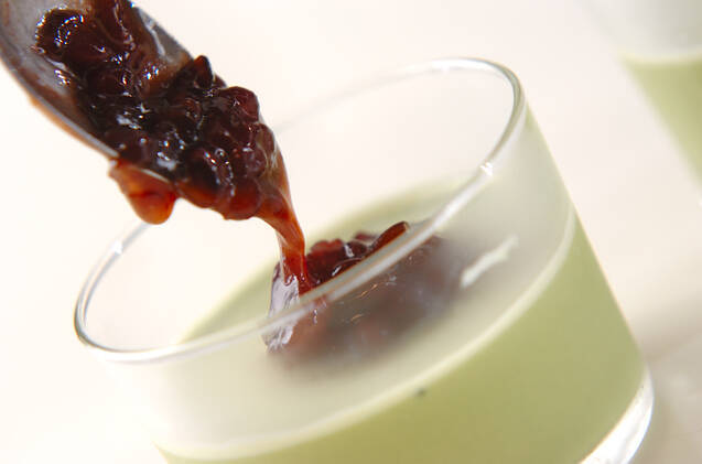<小豆ソース>をかけ、エディブルフラワーを散らす。
