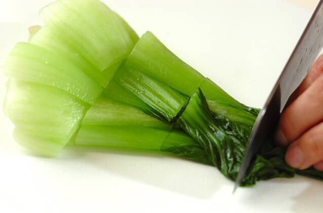 チンゲンサイは根元を切り落としてきれいに水洗いし、分量外の塩を入れた熱湯でゆでて水に取り、粗熱が取れたら水気を絞って長さ3cmに切る。