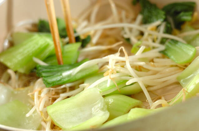 フライパンにゴマ油を入れて強火で熱し、しっかり水きりしたモヤシを炒め、チンゲンサイを加えてさらに炒め合わせる。