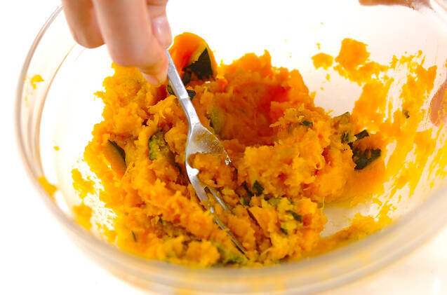カボチャはひとくち大に切ってサッと水に通し、ぬれたまま耐熱容器に重ならないように並べ、ラップを掛けて電子レンジで約6~7分加熱し、柔らかく蒸し状態にする。熱いうちに、フォーク等でつぶす。