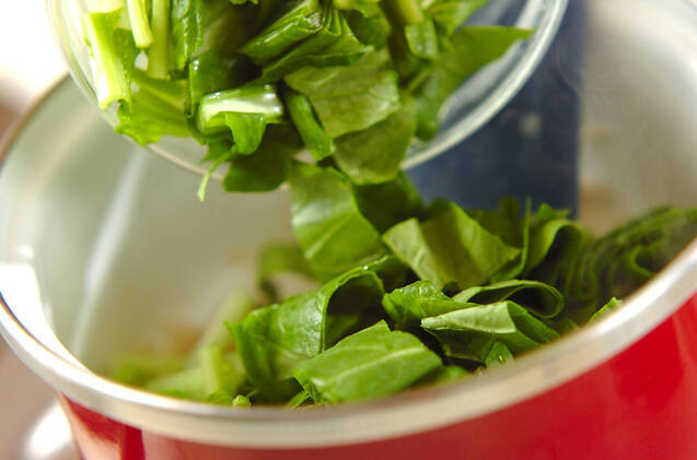 鍋にゴマ油を熱し、ショウガを炒める。香りがたったら鶏ひき肉を炒め、色が変わったら小松菜を加えてしんなりするまで炒める。
