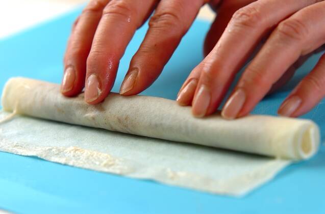 春巻きの皮に準備したバナナとこしあんをのせ、混ぜ合わせた<のり>をフチにぬり、手前からくるくると巻く。両端を押さえる。