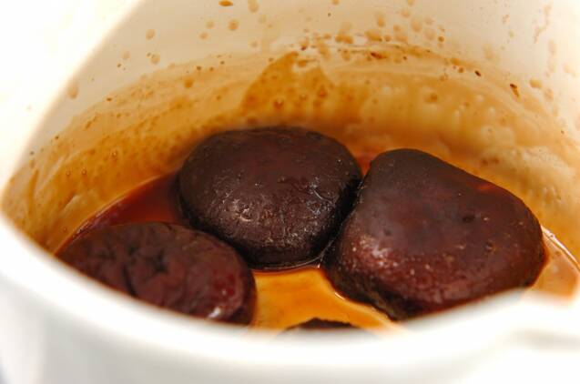 鍋に<シイタケの煮物>の材料を入れ、強火にかける。煮たったら火を弱め、煮汁がほとんどなくなるまで煮含め、粗熱が取れたら細切りにする。
