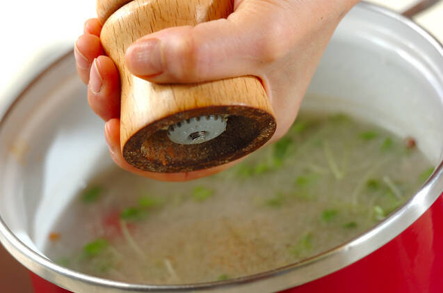 トロミがついてきたらプチトマトと貝われ菜を加え、塩コショウで味を調えて器に注ぐ。