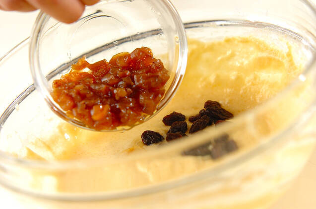 (2)にレーズンと梅酒の梅を混ぜ合わせ、分量外のサラダ油を薄く熱したフライパンで両面色よく焼く。器に盛って<ハニー梅酒>をかけ、ミントの葉を飾る。