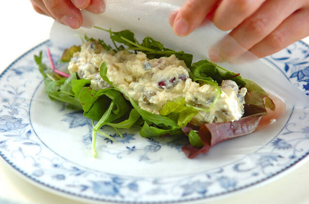 ライスペーパーの両面に霧吹きで水を吹き、皿に広げる。生ハム、ベビーリーフ、<ビーンズサラダ>をのせ、しっかり巻き込む。もう1本も同様に作る。