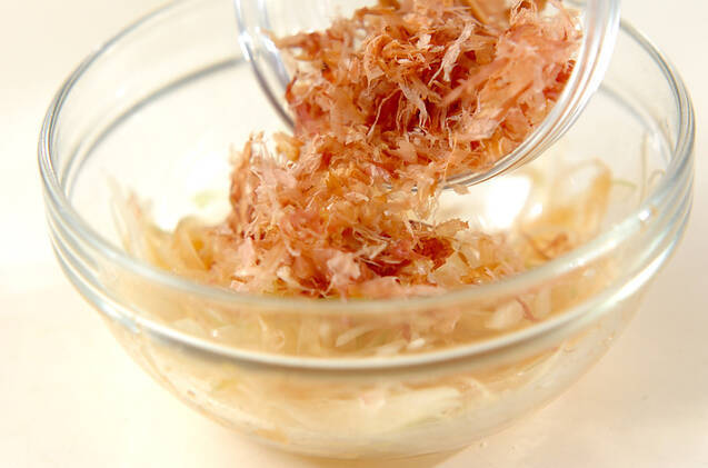 <玉ネギのおかか和え>を作る。玉ネギにポン酢しょうゆを加えて和え、さらにかつお節を加えて混ぜ合わせる。