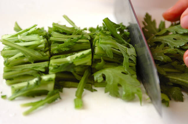 春菊は水洗いして根元を切り落とし、長さ3cmに切る。