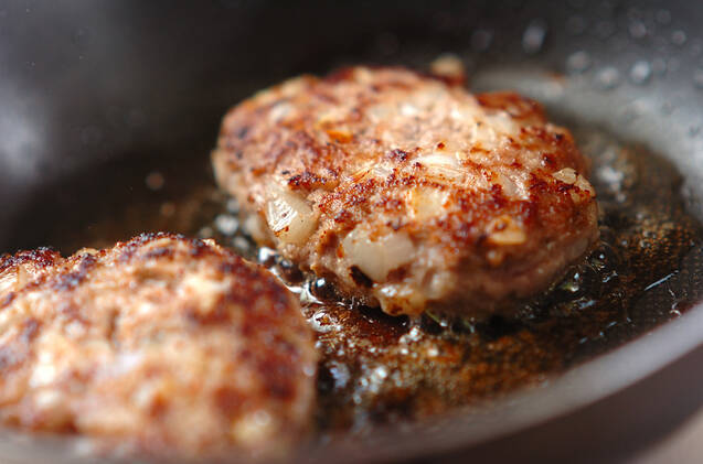 当日の朝はここからスタート!<ハンバーグタネ>を小判型に整え、分量外のサラダ油をひいたフライパンで、中に火が通るまで焼く。