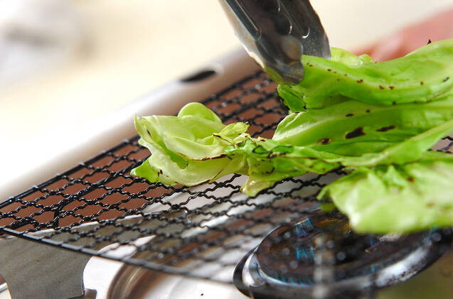焼き網を熱して薄くオリーブ油をひき、キャベツをのせる。キャベツに少し焼き焦げが出来るくらいまで焼いて器に盛り、食べる直前に<ドレッシング>をかける。