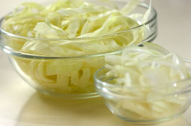 キャベツは幅5mmの細切りにする。玉ネギは薄切りにする。