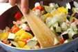 鍋にオリーブ油を熱し、玉ネギ、水気をきったナス、セロリ、パプリカ、ベーコンを炒め合わせる。