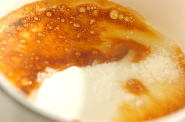 <キャラメルミルク>を作る。小鍋に砂糖を入れて中火にかけ、キャラメル位の茶色になるまで焦がす。温めておいた牛乳を少しずつ加え、弱火にかけて煮溶かす。