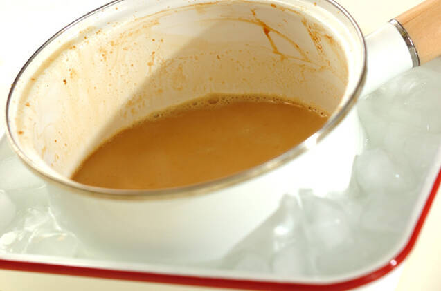 火を止めて鍋ごと氷水につける。粗熱が取れたら、バニラエッセンスを加え、冷蔵庫で冷やす。