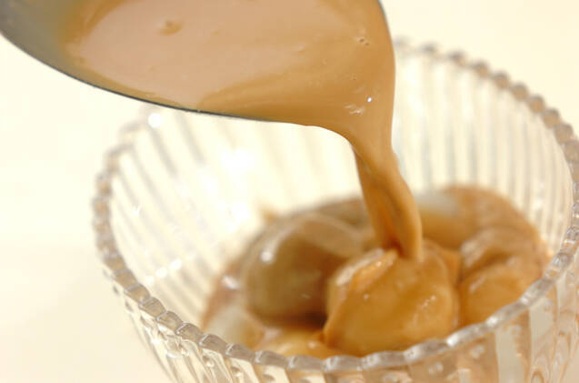 器に(1)の白玉団子を入れ、(3)の<キャラメルミルク>を注ぐ。