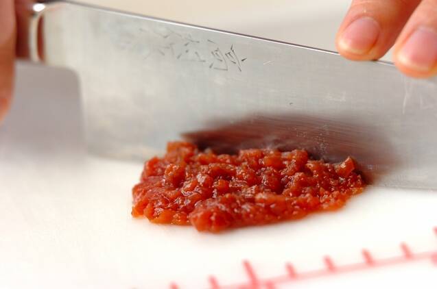 梅干しは種を取り除き、包丁でペースト状になるまでたたく。ボウルに全ての材料を入れて和え、器に盛る。
