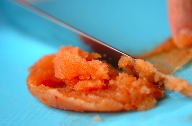 大根は皮をむき、短冊切りし、明太子は薄皮に切り込みを入れ、中身をしごきだす。