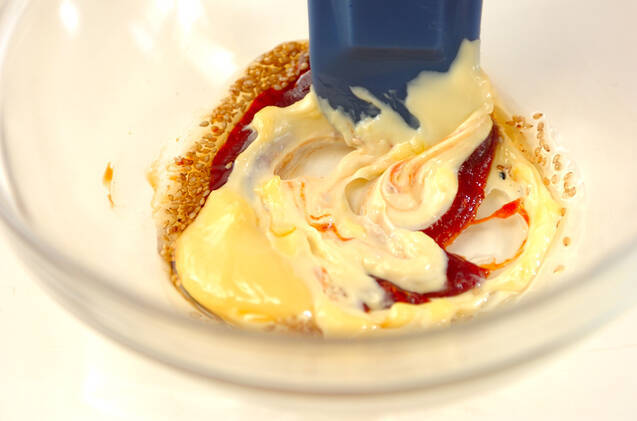 ボウルで<ソース>の材料を混ぜ合わせる。
