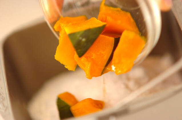 ホームベーカリーのパンケースに羽根をつけ、卵と水を合わせたもの、強力粉、薄力粉、砂糖、塩、インスタントドライイースト、バター、バニラオイル、カボチャを入れ、本体にセットする。※入れる順番やタイミング等は機種によって異なります。