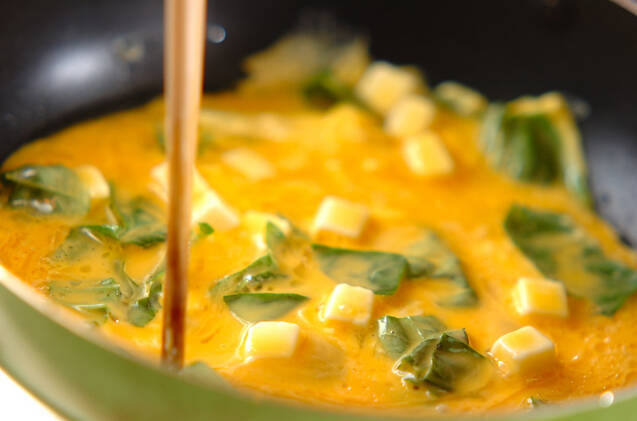 フライパンにサラダ油大さじ1を入れ中火にかけ、フライパンが熱くなったら(1)の卵を一気に流し込み、菜ばしで手早く全体にかき混ぜる。