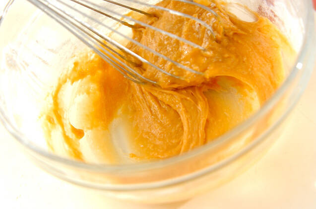 ボウルに卵を割り入れ、キャラメルシュガー、牛乳を加えて混ぜる。振るった粉類を加え、粉っぽさがなくなるまで混ぜ合わせ、15~20分冷蔵庫で休ませる。
