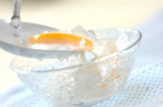 (1)に水気をきったタピオカを入れ、氷の入った器に注ぎ、チェリーを飾る。