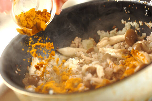 豚ひき肉とシメジを加えて炒め合わせ、火が通ったらカレー粉、みそ、酒を加えて炒め合わせ、塩で味を調える。器にご飯をよそい、カレーをかけ、香菜を散らす。