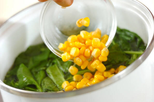 鍋に<スープ>の材料を入れ、よく混ぜ合わせながら中火にかけ、固形チキンスープの素が溶け、スープにトロミがついてきたらホウレン草、水煮コーンを加える。