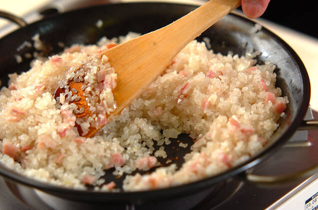 パエリア鍋にニンニク、オリーブ油を入れて火にかけ、ニンニクの香りがたってきたら、玉ネギ、ベーコンを加えて炒め、さらにお米を加えてお米が透き通るまで炒める。
