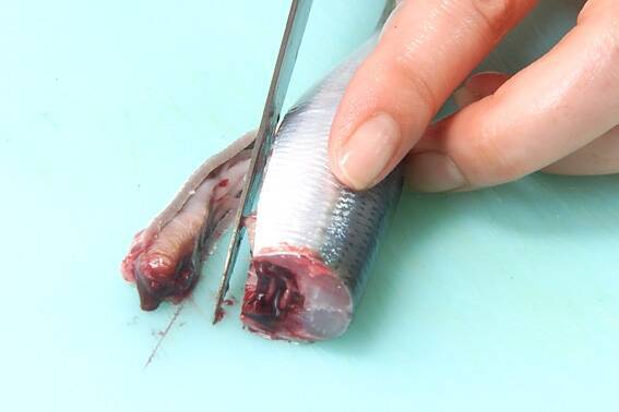 イワシは尾から頭に向かって指でウロコを取り、包丁で頭を落とし、腹側を斜めに切ってワタを出し、水洗いする。頭側の骨の上に親指を差し込み、骨にそって尾に指を滑らせ、イワシを開く。