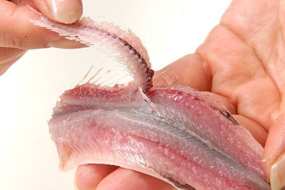 尾のつけねで骨を折り、頭に向かって骨をはがすように取る。サッと水洗いして水気を拭き取り、塩を振る。