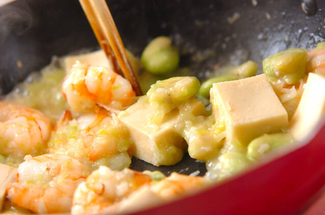 煮汁が半量になったら<水溶き片栗>をまわし入れて大きく混ぜる。トロミがついてきたら、薄口しょうゆを加え、全体に混ぜ合わせて、器に盛り分ける。