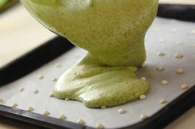 冷凍していた天板に(1)を流し入れ、表面を平らにならす。予熱したオーブンに入れ、180度で13分程度焼く。焼きあがったら裏返してケーキクーラーにのせ、オーブンシートをすぐに取って冷ましておく。