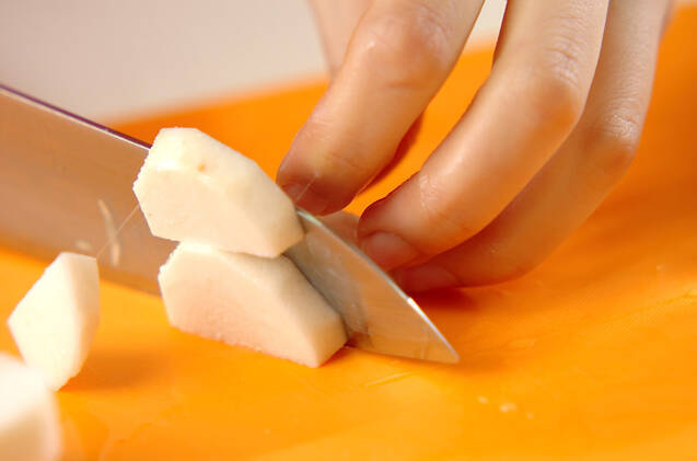 里芋は皮をむいて縦半分に切り、さらに幅6~7mmに切る。